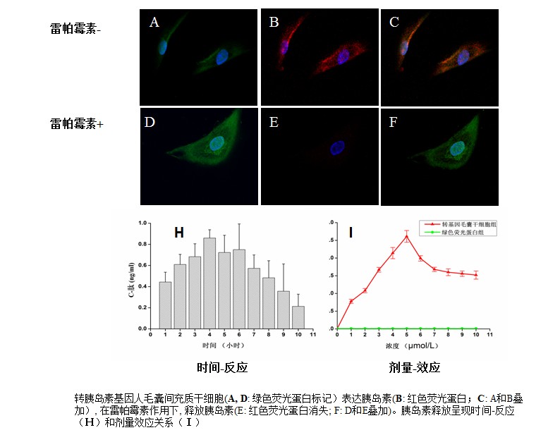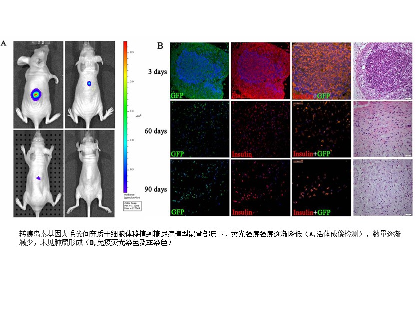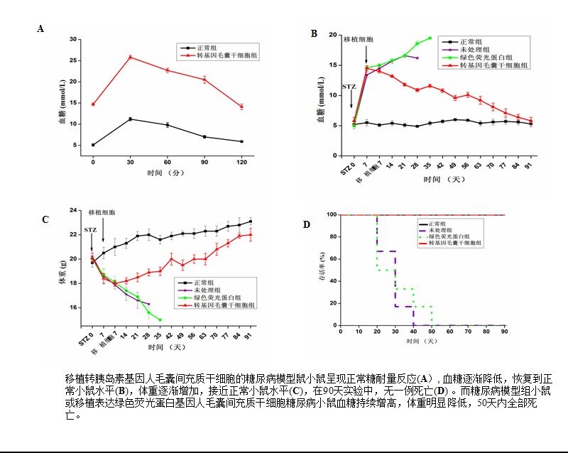 利用分子生物学技术,将目的基因导入患者体内,使目的基因产物得以表达,从而达到治疗疾病的目的,这种技术称为基因治疗。我校病理生物学教育部重点实验室研究人员利用慢病毒载体,将靶向可控的人胰岛素基因转导到人毛囊间充质干细胞中。这种转基因的人毛囊间充质干细胞持续表达胰岛素,但不释放胰岛素。只有在外来药物-雷帕霉素作用下,胰岛素才从细胞内释放出来。这种转基因人毛囊间充质干细胞移植到糖尿病模型小鼠体内,在雷帕霉素作用下,释放胰岛素,逆转糖尿病鼠高血糖,恢复糖尿病鼠体重。移植这种转胰岛素基因毛囊间充质干细胞的糖尿病鼠在长达90天的试验中无一例死亡,而糖尿病模型组或移植转绿色荧光蛋白基因毛囊间充质干细胞的糖尿病鼠(对照组),在糖尿病模型建立后20天开始死亡,35天内全部死亡。该研究内容发表在“Cell Transplantation”2014 May 15. [Epub ahead of print]。