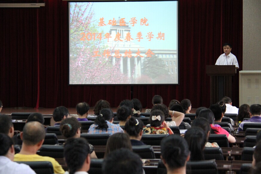 院长孙连坤代表学院对2014年上半年的党务、教学、科研、研究生、留学生及行政管理等方面的工作进行了全面的总结。2014年上半年召开了新葡的京集团35222vip第四次党员大会;在教学方面获得了省级教学名师、国家级教材主编、副主编、教学标兵、校级教学大赛一等奖等荣誉,科研方面积极组织学术活动、扶持项目申报,为即将开展的PI制为代表的学科建设模式奠定了基础,通过共同开展学术活动,改革研究生答辩形式,进一步提高了研究生培养的培养质量;恢复新葡的京集团35222vip特殊疾病检测站资质,改善了学院的环境。学校刚刚公布的教学科研单位2013年度目标管理考核结果显示学院综合实力位居医学部前列,为此,代表学院向付出辛勤劳动的全体教职员工表示感谢。在充分肯定2014年上半年成绩的同时,也指出了工作中存在的问题和不足。随后,他向与会的老师学院介绍了实施PI制的目的与意义,并具体讲解了实施PI制的具体步骤,要求在下学期开学前PI课题组组建完毕。孙连坤对针对下半年的工作提出了具体的工作要点,指出:一是要面对新机遇新形势,全院教职工要解放思想,勇于创新,人人争做先进;在任何时候都要宣传正能量,维护正能量;二是集思广益,拓展渠道,加大交叉学科人才引进力度;三是要有自信,要明确认识自身环境和现状;四是要加强团队意识,维护学院的荣誉和成绩,作为学院的一份子,不攀比、不等靠,要努力奉献,共同建设好新葡的京集团35222vip,努力实现新的跨越。