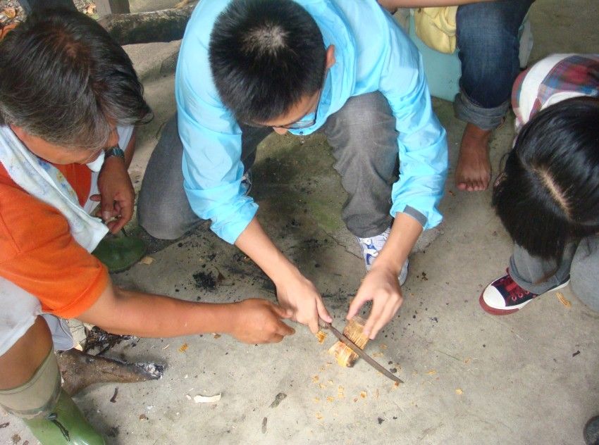 简单休整,我们被分为三组,由三位布农族大哥进行三种技能的训练。我所接受的第一项训练是生火,布农族大哥说火是生存的基本。在他的介绍下我们认识了深山中木材的种类并了解了生火的基本过程。第二项训练是识别植物种类。原始森林就是一个天然的冰箱,学会就地取材能帮助布农族猎人在不携带食物的情况下生存十几天。最后一项技能是学习制作陷阱,这是捕猎的基本步骤。教练交给了我们两种陷阱的制作方法并让我们实地体验尝试。