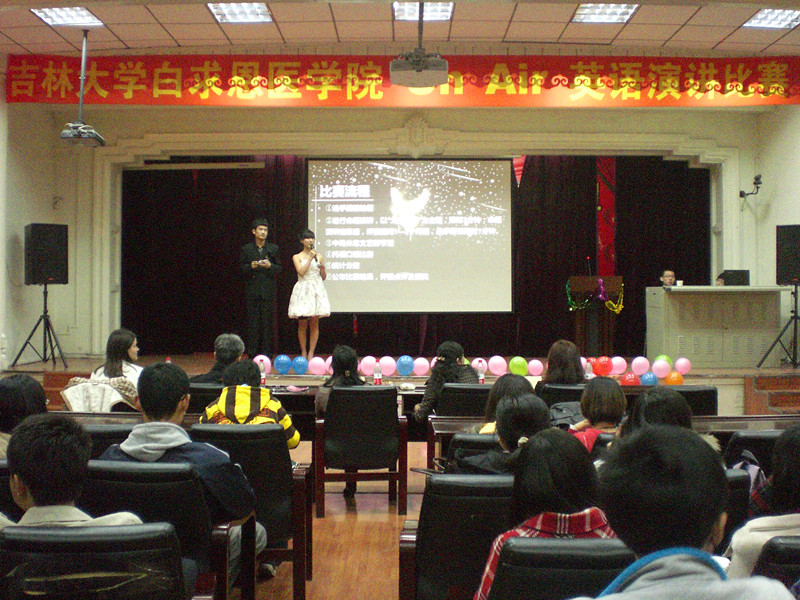 4月15日晚,白求恩医学院2012年文化节系列活动之“on air”英语演讲比赛在学院基础楼二楼多功能学术报告厅举行,比赛邀请到新葡的京集团35222vip公共外语教育学院副教授田平等担任评委,经初赛选拔的2010级与2011级共10位同学参加了比赛。