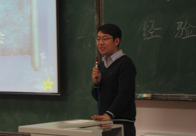 黄虎就“挑战杯”全国大学生课外学术科技作品竞赛作了介绍,从比赛章程、信息获取、申报材料以及比赛现场等方面作了细致的讲述。宋殿一通过自己的参赛经历向同学们介绍了创业计划大赛的相关情况,并将自身的感悟与同学们分享,使大家理解到参赛的重要意义。诙谐的语言,生动的描述赢得了在场同学的阵阵掌声。