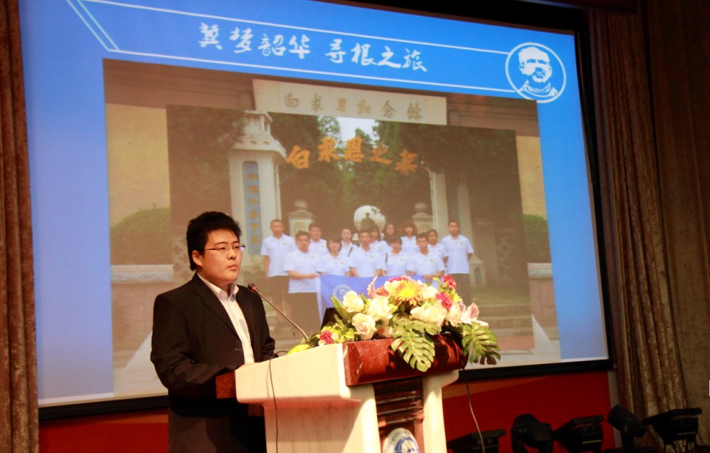 白求恩医学院6名志愿者分别从当今志愿活动开展形式、志愿服务精神的传承等角度,结合自身的志愿活动经历,向大家介绍目前医疗志愿服务的开展状况。演讲中,白求恩医学院高倩从关怀、包容、感恩三个角度诠释了白求恩精神;王颖则从医治身体更应医治心灵的医学人文性角度,对志愿服务进行了哲学分析与思考。志愿者生动的讲述与感人的志愿活动经历,令现场响起阵阵掌声。701003班刘相良与大家分享了白求恩医学院志愿者走进长春边防检查站、在吉大一院开展导诊等志愿活动的心得体会,其中“冀梦韶华,寻根之旅”河北唐县牛眼沟村支教活动,令观众体会到当今社会白求恩精神传承的重要性,激起现场观众投入医疗志愿活动的热情。